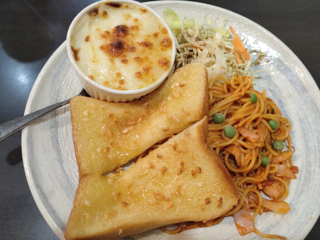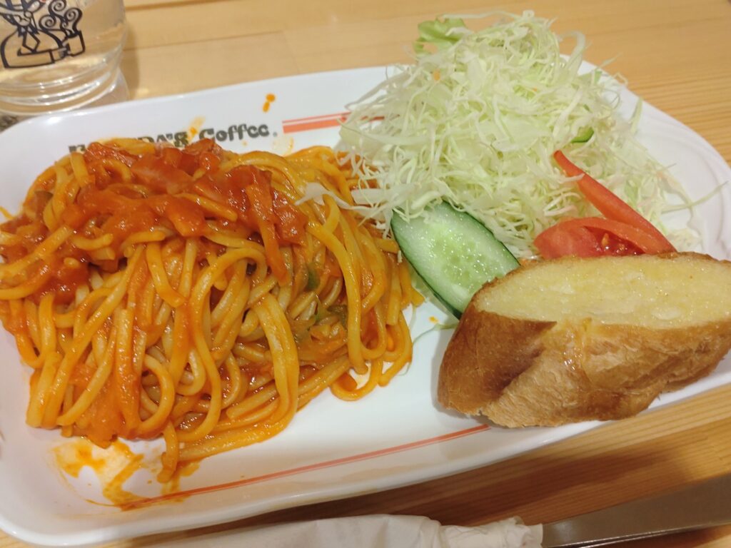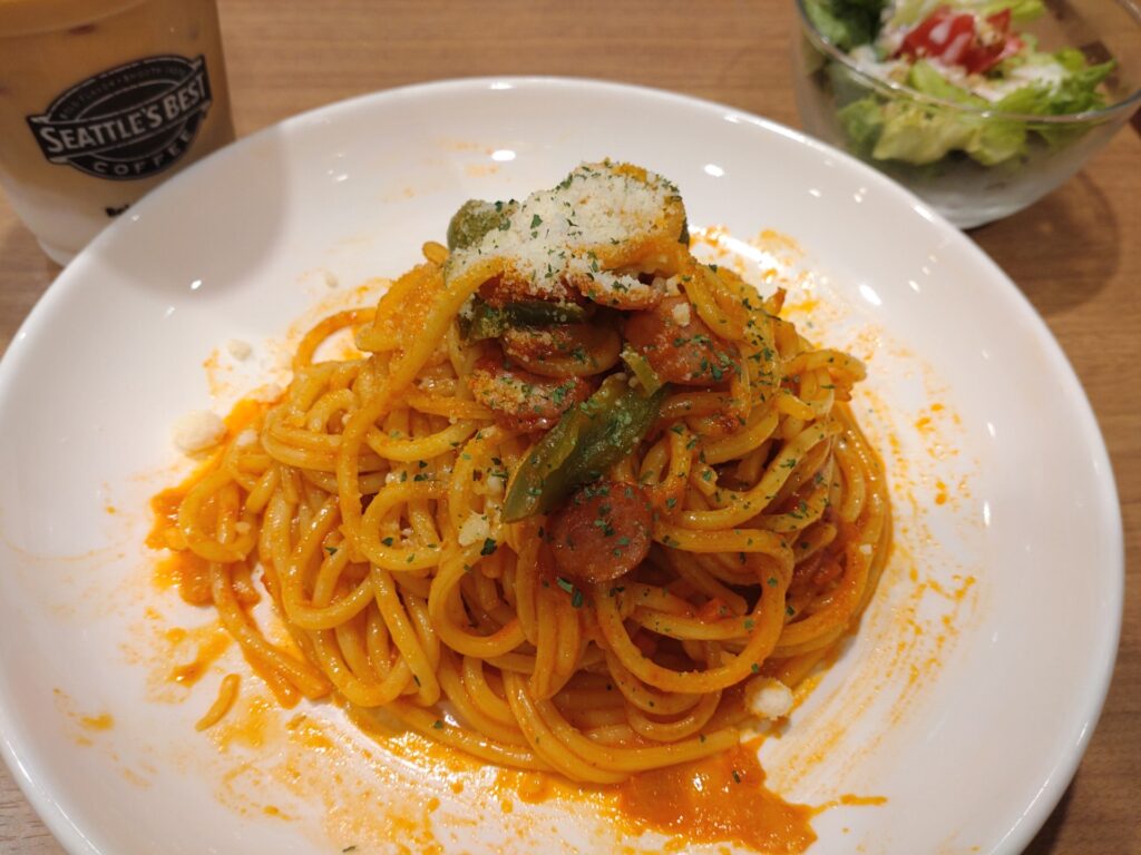 こちらでは初のフード体験。ナポリタンにカフェラテをセットで。