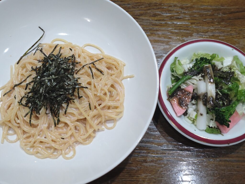 明太子のパスタランチに決定、950円でサラダとドリンク付き。