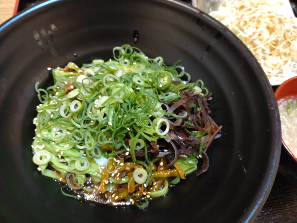 そして混ぜていると下から出てきたのは緑の麵。