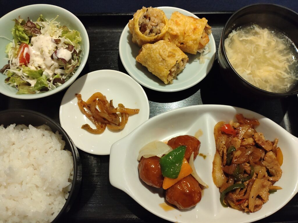 この日はは春巻き、甘酢肉団子などのセットになっていました。