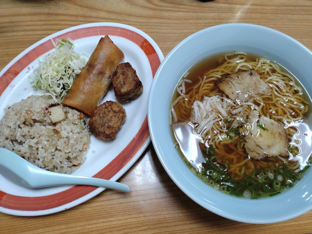 揚げシュウマイと春巻き、炒飯と中華そばがセットで1000円。